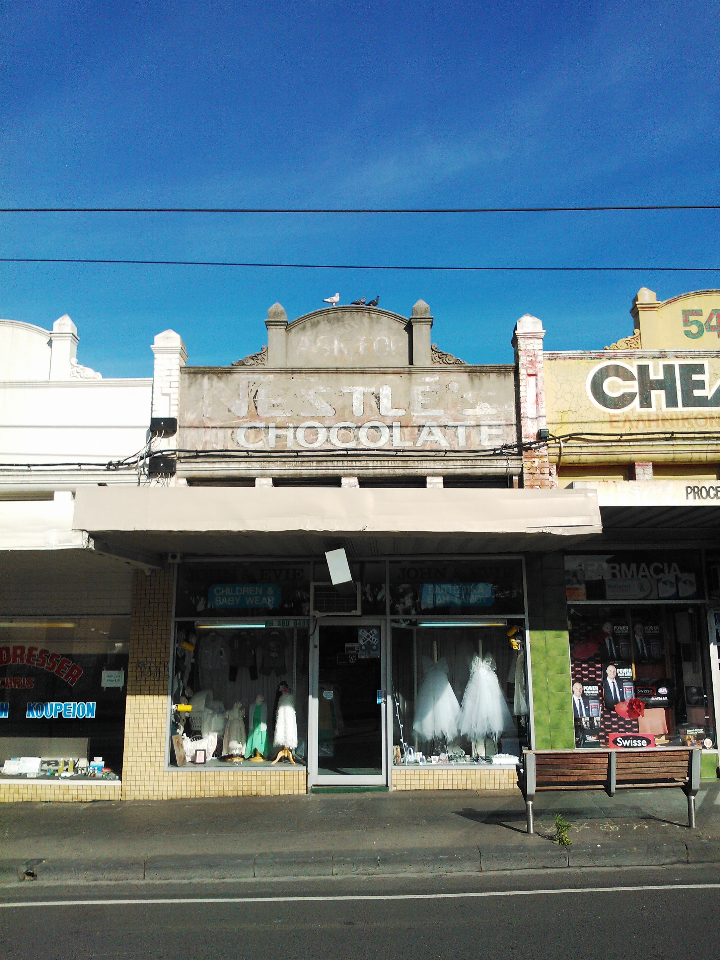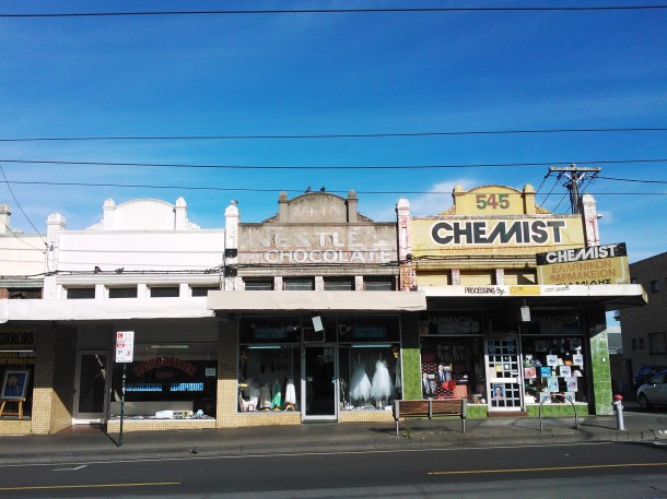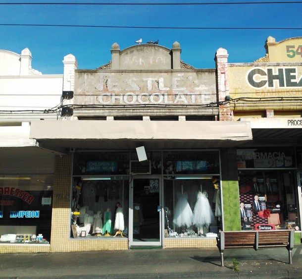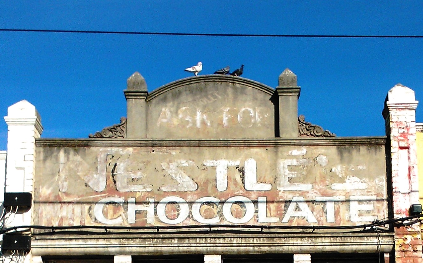 Nestle’s Chocolate Posted on October 3, 2012 by Matt Leave a comment Sydney Rd, Brunswick. Right next door to our good friends at Steve Siamidis Pharmacy. What a sweet sign! And if you look close you can make the a Violet Crumble ad at the very top, too. “Side by side, we stick togetheeeeeerrr … ” Share this: Share on X (Opens in new window) X Share on Facebook (Opens in new window) Facebook Like Loading... Related