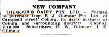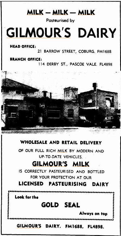 Gilmours dairy was situated in Barrow Street Coburg.I know because, as a signpainter I did work for them. R W